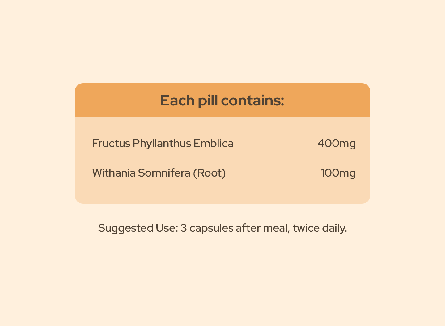 Studies suggest that ashwaganda helps to reduce cortisol (the stress hormone), while Amla helps protect the body from the physical effects of stress. Together, they provide a more comprehensive approach to managing stress and anxiety.